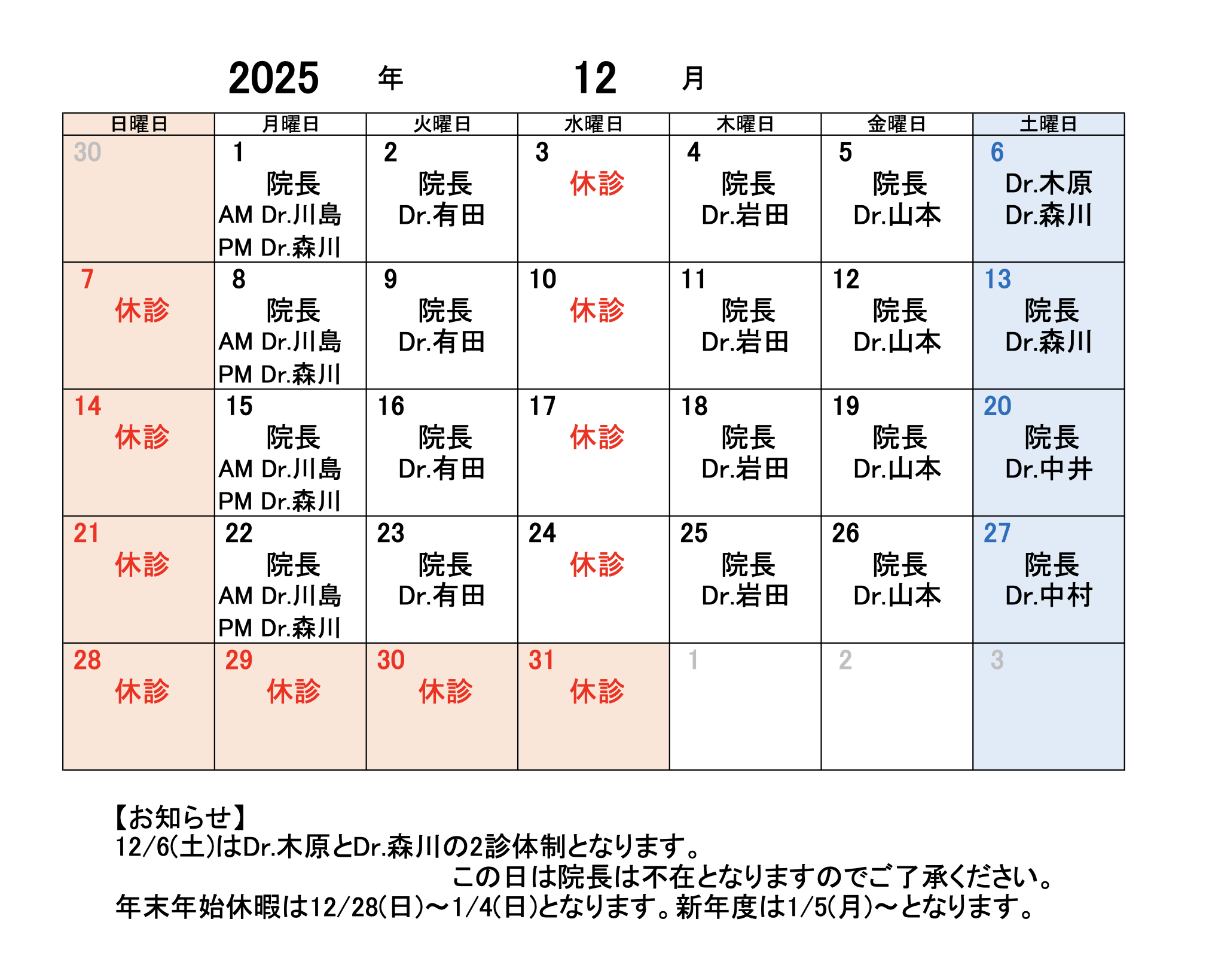 12/6(土)はDr.木原とDr.森川の2診体制となります。この日は院長は不在となりますのでご了承ください。