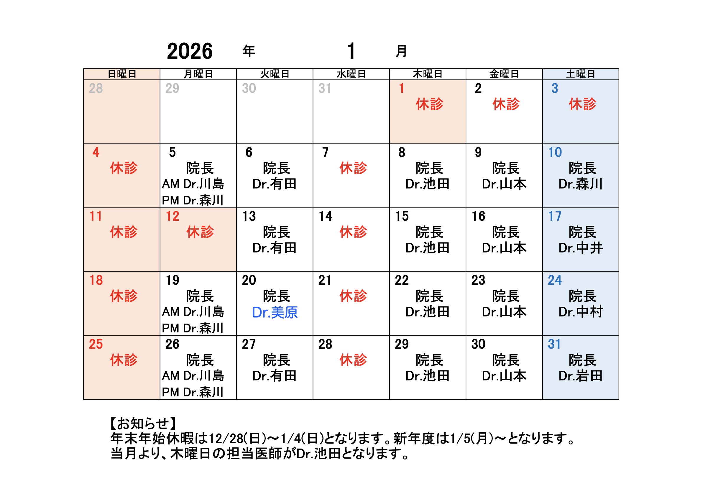 2026年1月 外来担当医表 |